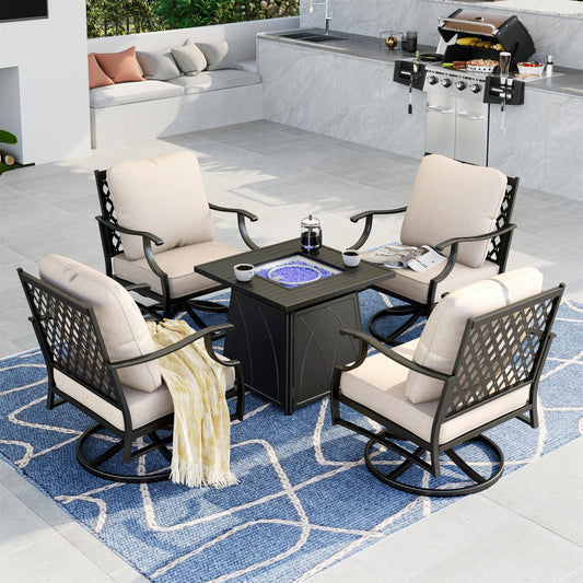 Summit Living 5 PCS Outdoor Conversation Set with 28-Inch Square Fire Pit Table Patio Furniture Sectional Sofa with Beige Cushions for 4 People