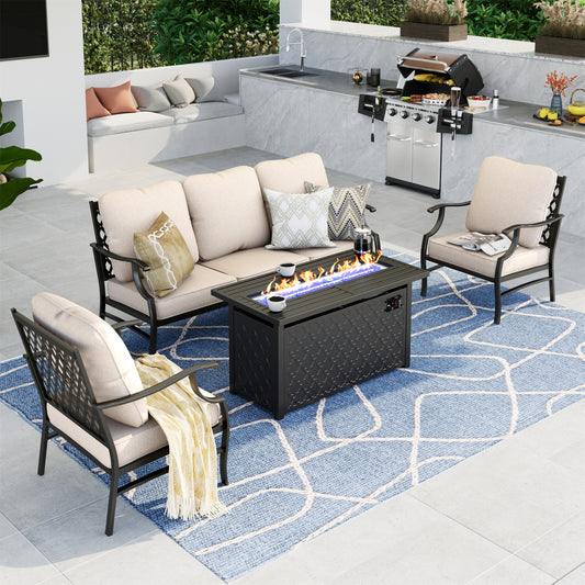 Summit Living 4 Pieces Patio Conversation Set with 45-Inch Gas Fire Pit Table Outdoor Furniture Sectional Sofa Set with Beige Cushions for 5 Person