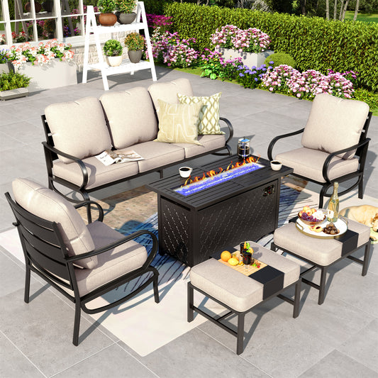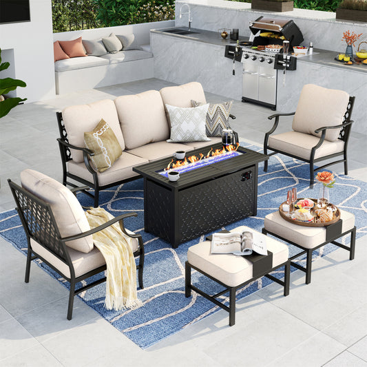 Summit Living 6 Pieces Patio Conversation Set with 45" Rectangle Fire Pit, Outdoor Metal Furniture Sofa for 7 Person, Beige Cushions