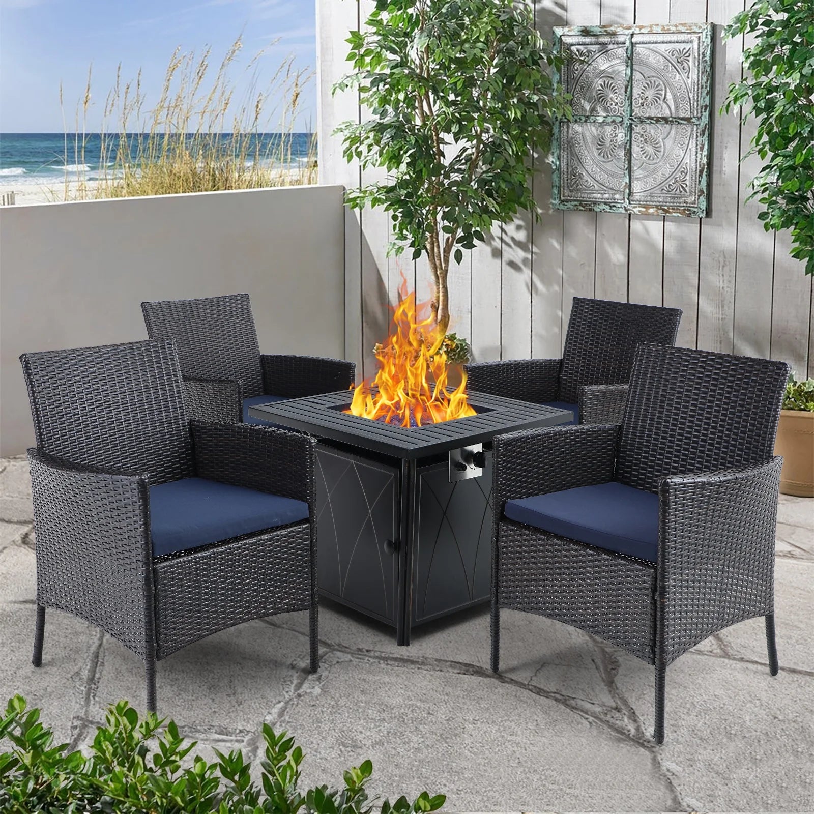MF Studio 5 PCS Outdoor Patio Furniture Set with 28-inch 50,000 BTU Fire Pit Table Patio Conversation Set with Navy Blue Cushions