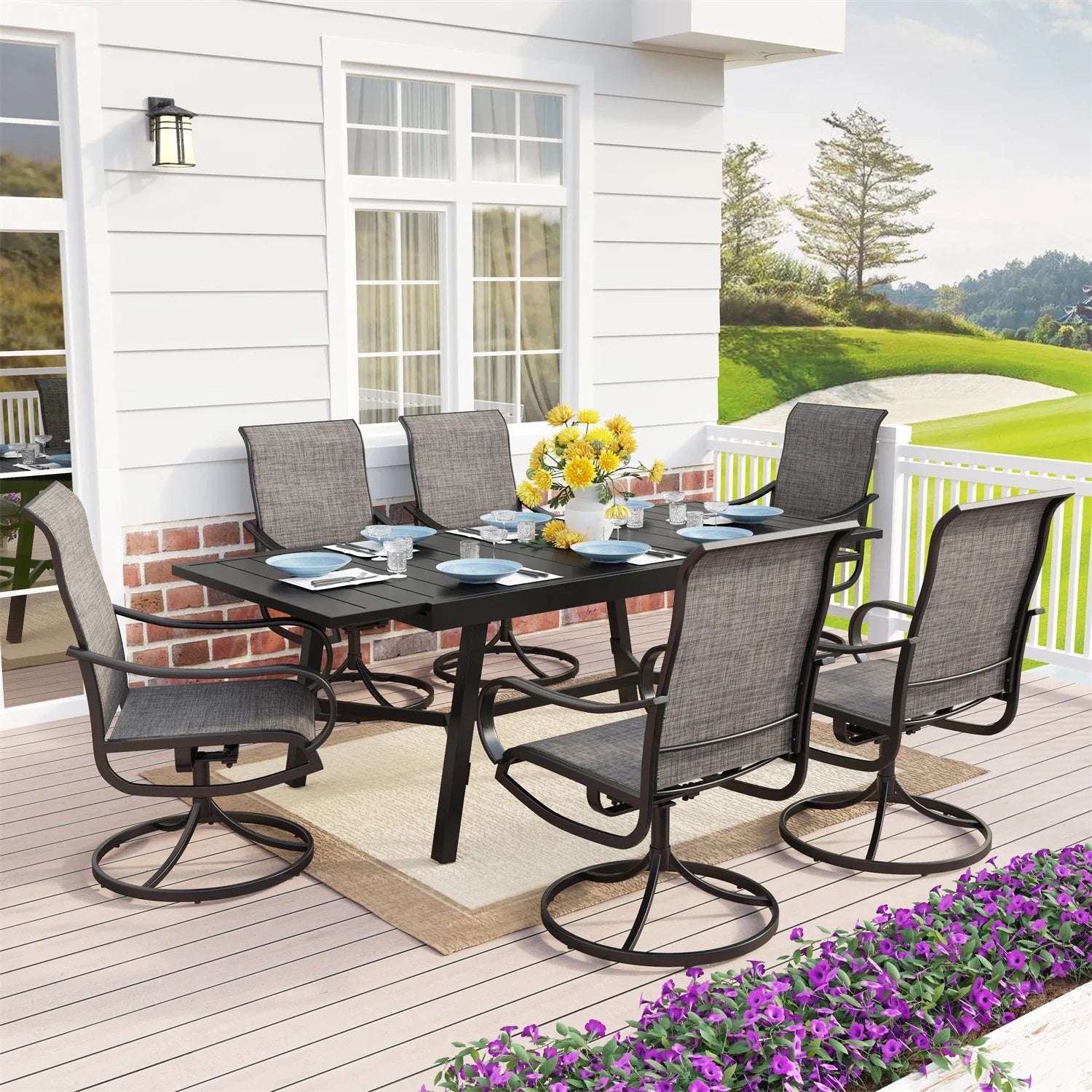 MF Studio 6 Seat Metal Outdoor Patio Dining Set with Expandable Table & 6 Swivel Textilene Chairs, Black & Gray-Brown