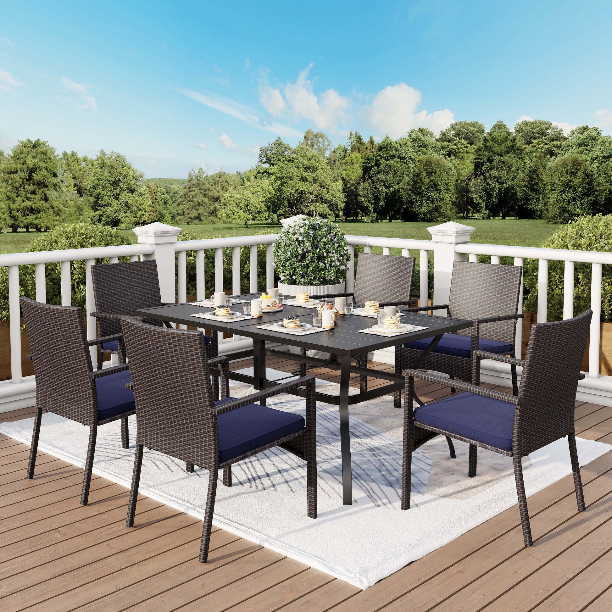 MF Studio 7 Piece Outdoor Patio Dining Sets with 1 PC Rectangle Metal Table and 6 PCS Rattan Cushioned Chairs Navy Blue