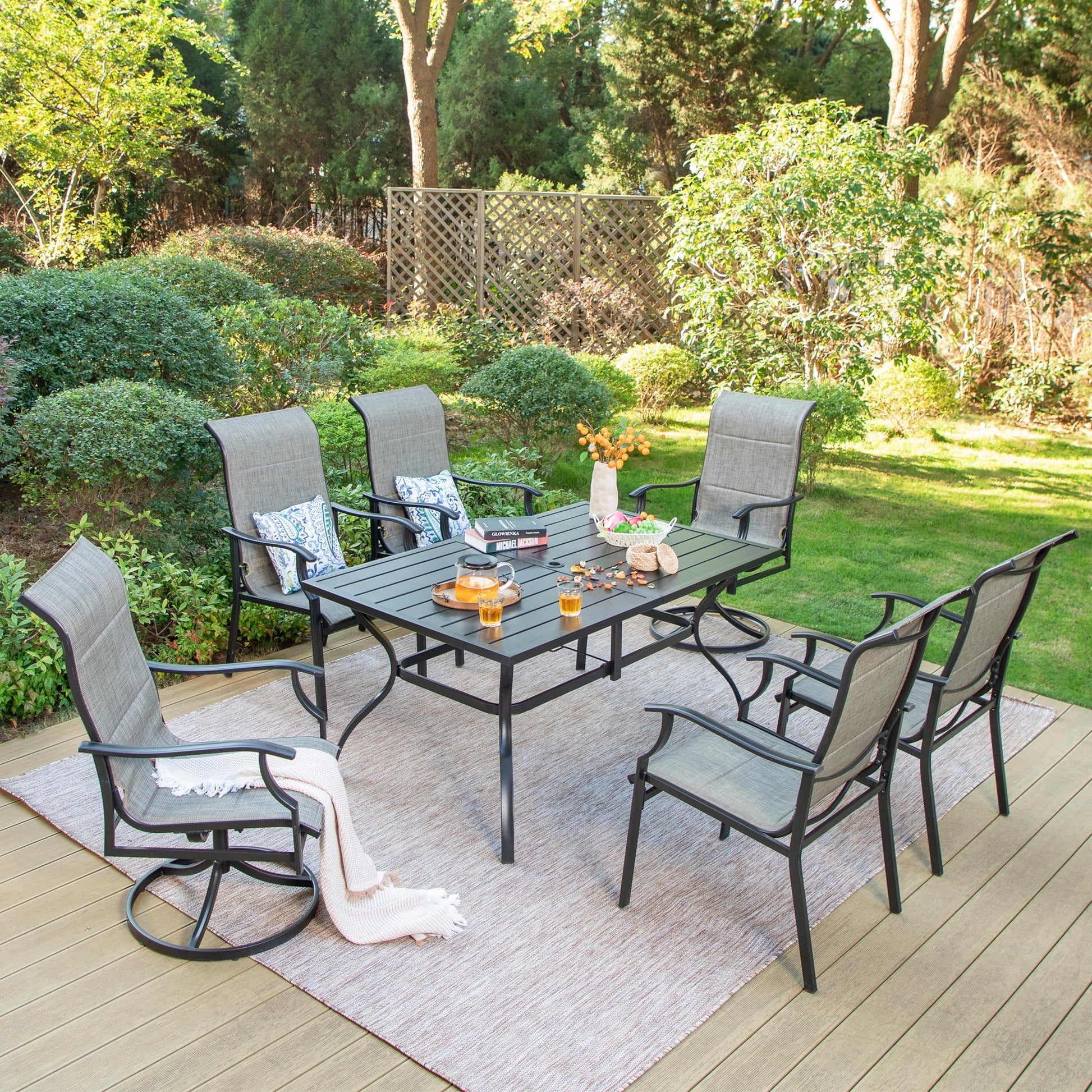 This 7PCS patio dining furniture sets include 4pcs fixed patio chairs, 2pc swivel patio chairs and 1pc patio dinning table. The chair is made of powder-coated steel frame, rustproof and weather resistant. Fixed Chair Dimension: 23.4"L x 24.8"W x 41"H. Extra-large seating area and fully padded seat and back provide great comfort. Economically high back design can better support your neck and head, help you relax completely. The chair back is shaped to the natural curves of your back for long-lasting comfort. Breathable Textaline sling fabric is strong, UV-resistant, and quick to dry - perfect for poolside dining. Quick-dry sponge seat and back will provide you with more comfort in Summer. Our table and dining chairs frame is made of high quality steel frame, which is all weather resistant and do not need extra maintenance. Large rectangle tabletop for dinner and coffee time. Provides you enough spaces for joyful times.