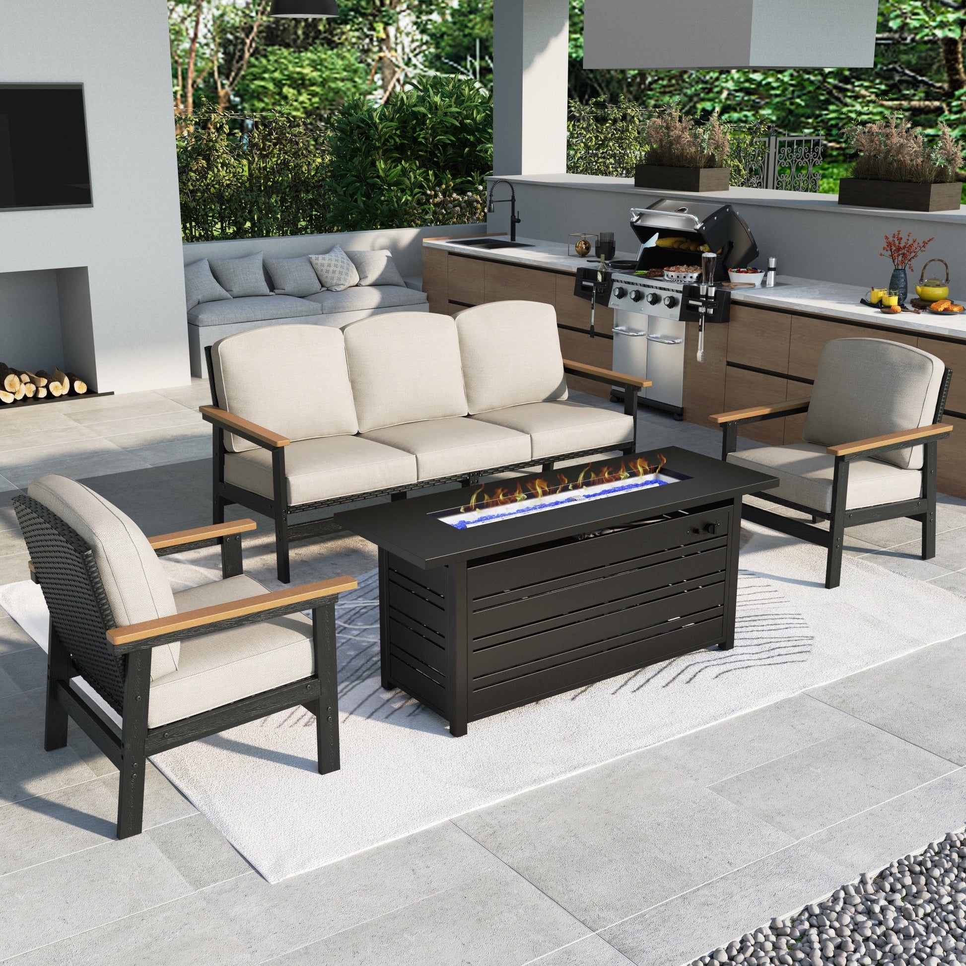 MF Studio HDPE Patio Furniture Set with Fire Pit, 4-Piece HDPE & Wicker Outdoor Conversation Set with 56" Fire Pit Table, Black