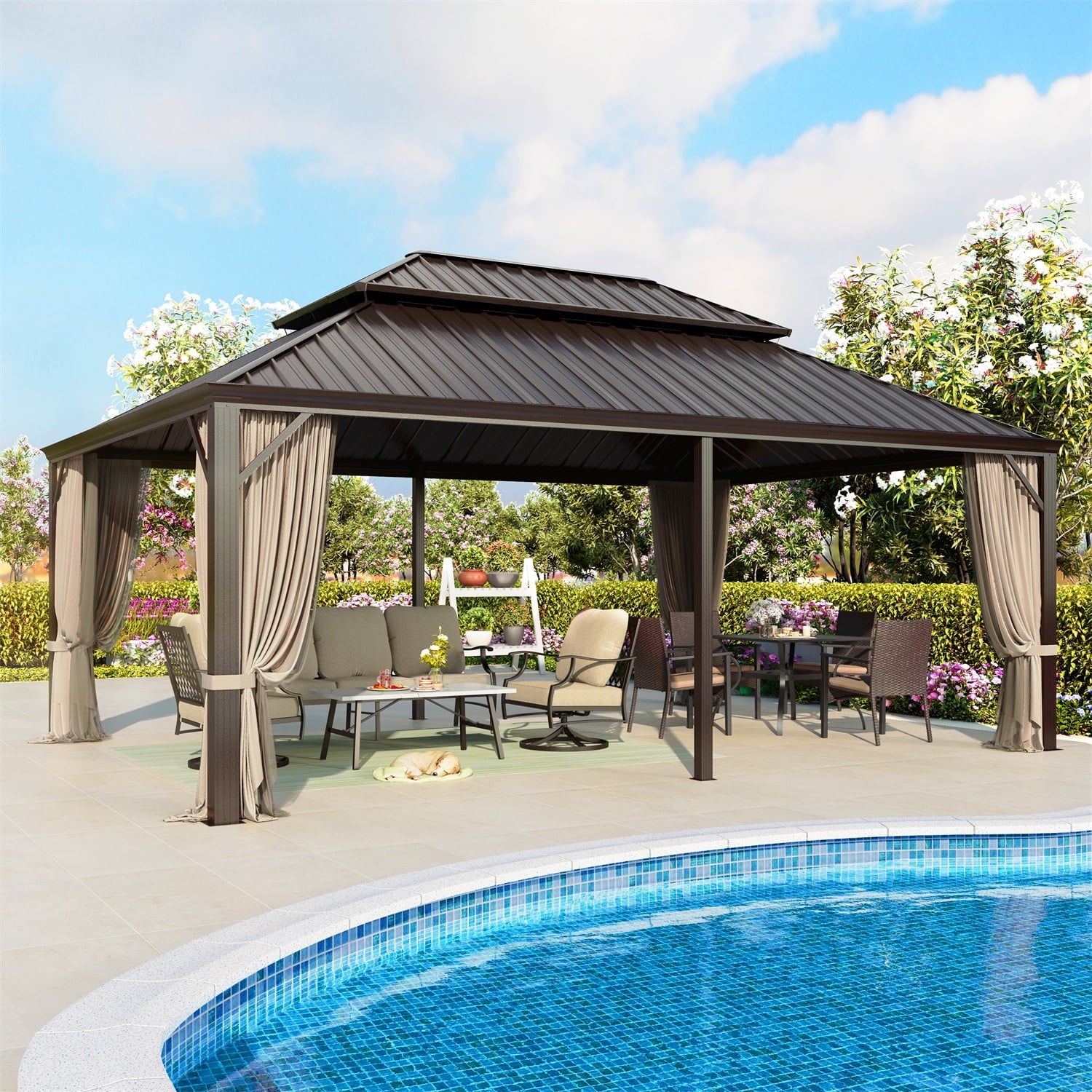 Summit Living 14 x 20 FT Hardtop Gazebo Aluminum Frame Galvanized Steel Double Roof Patio Gazebo with Netting Curtains Brown