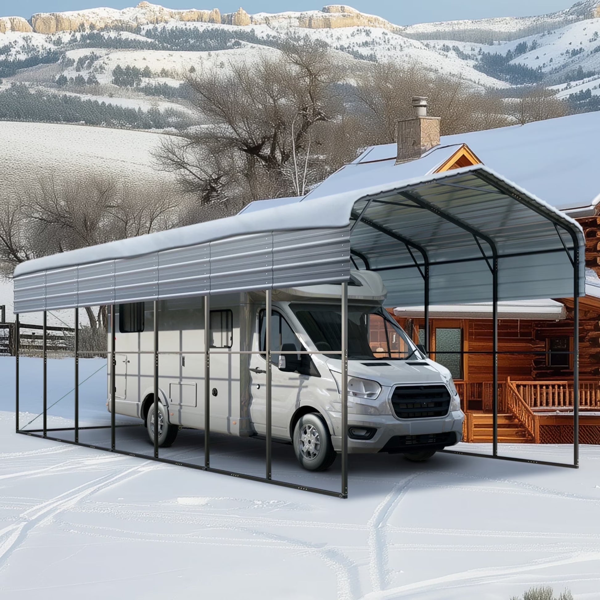 Introducing the Summit Living outdoor heavy-duty metal carport, the perfect solution to protect your vehicles and outdoor equipment from the elements. Constructed with a robust steel frame and a durable metal panel roof, this carport is designed to shield your car, RV, or boat from harsh winds, rain, and intense sunlight.