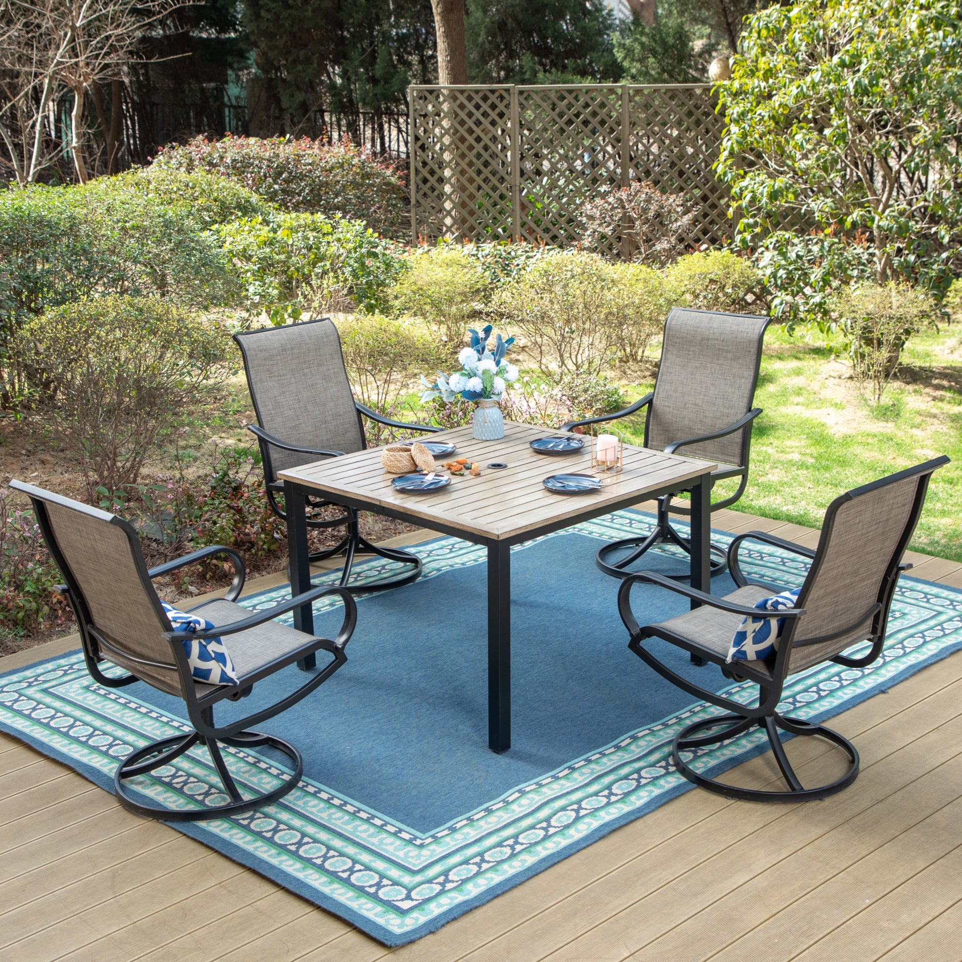Summit Living 4-seat Outdoor Dining Set with Swivel Chairs & Wood-look Table, 1.75" Umbrella Hole, Black & Brown-Gray