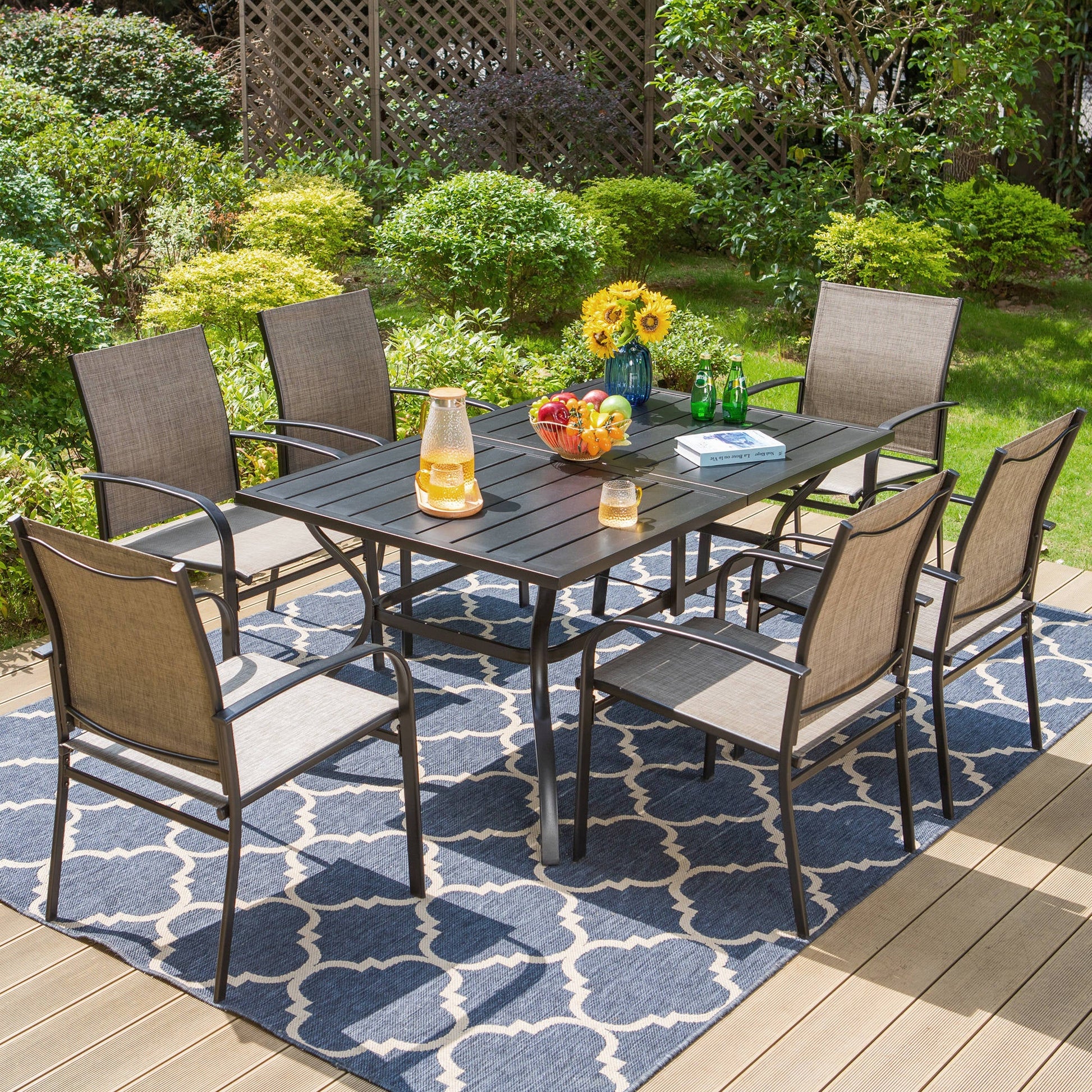 Summit Living 7-Piece Outdoor Dining Set with Textilene Chairs & Umbrella Support, Black & Brown