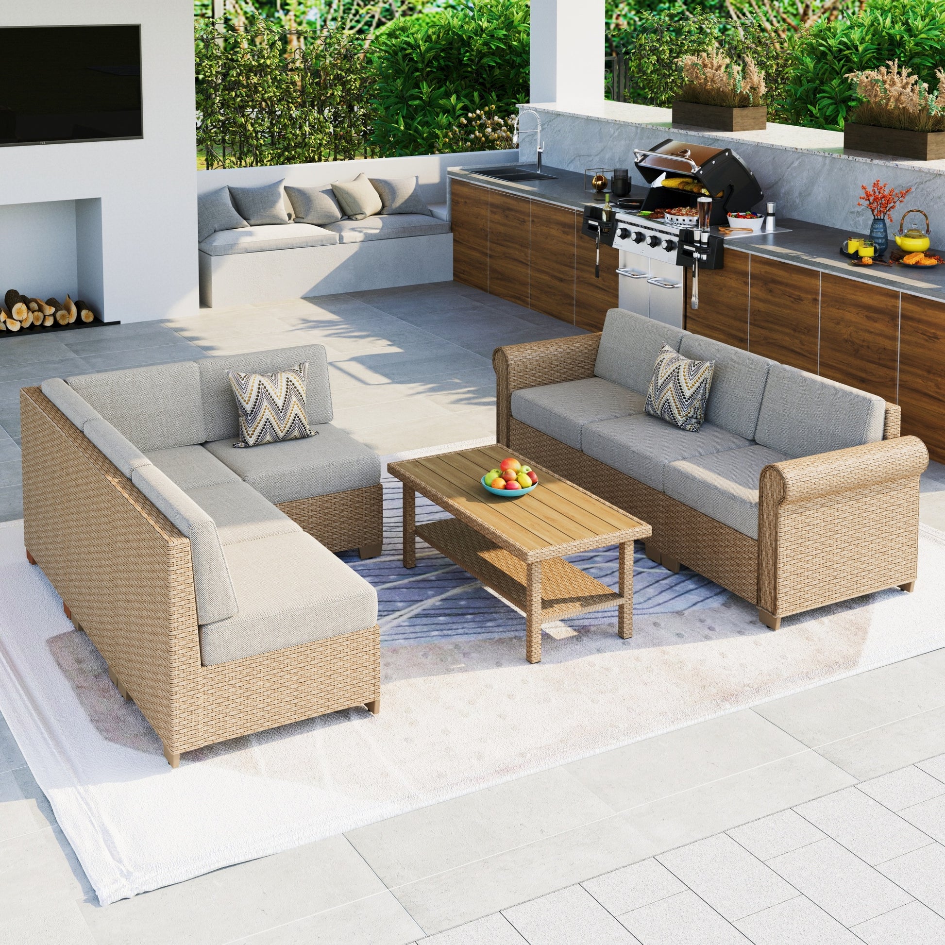 Summit Living 8-Piece Wicker Outdoor Patio Furniture Set, 7-Seat Rattan Outdoor Patio Sectional Conversation Set with Double-Shelving Faux Wood Coffee Table, Beige