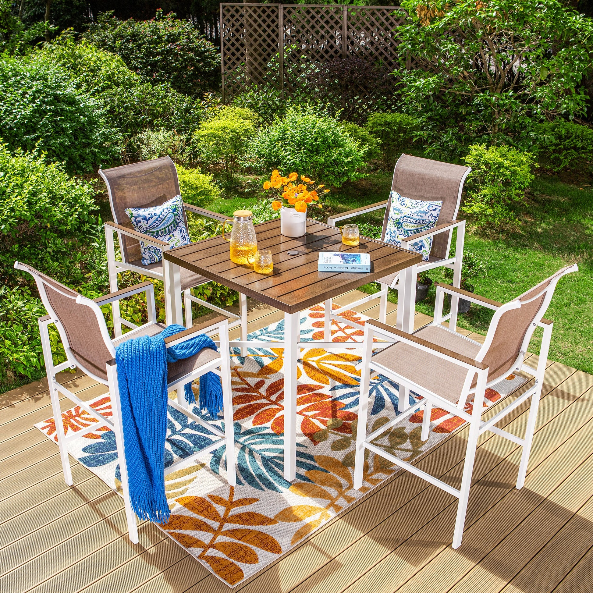 Summit Living Outdoor Bar Stool Dining Set of 5, Patio Counter Height Textilene Chairs with High Back and Armrest, While & Brown