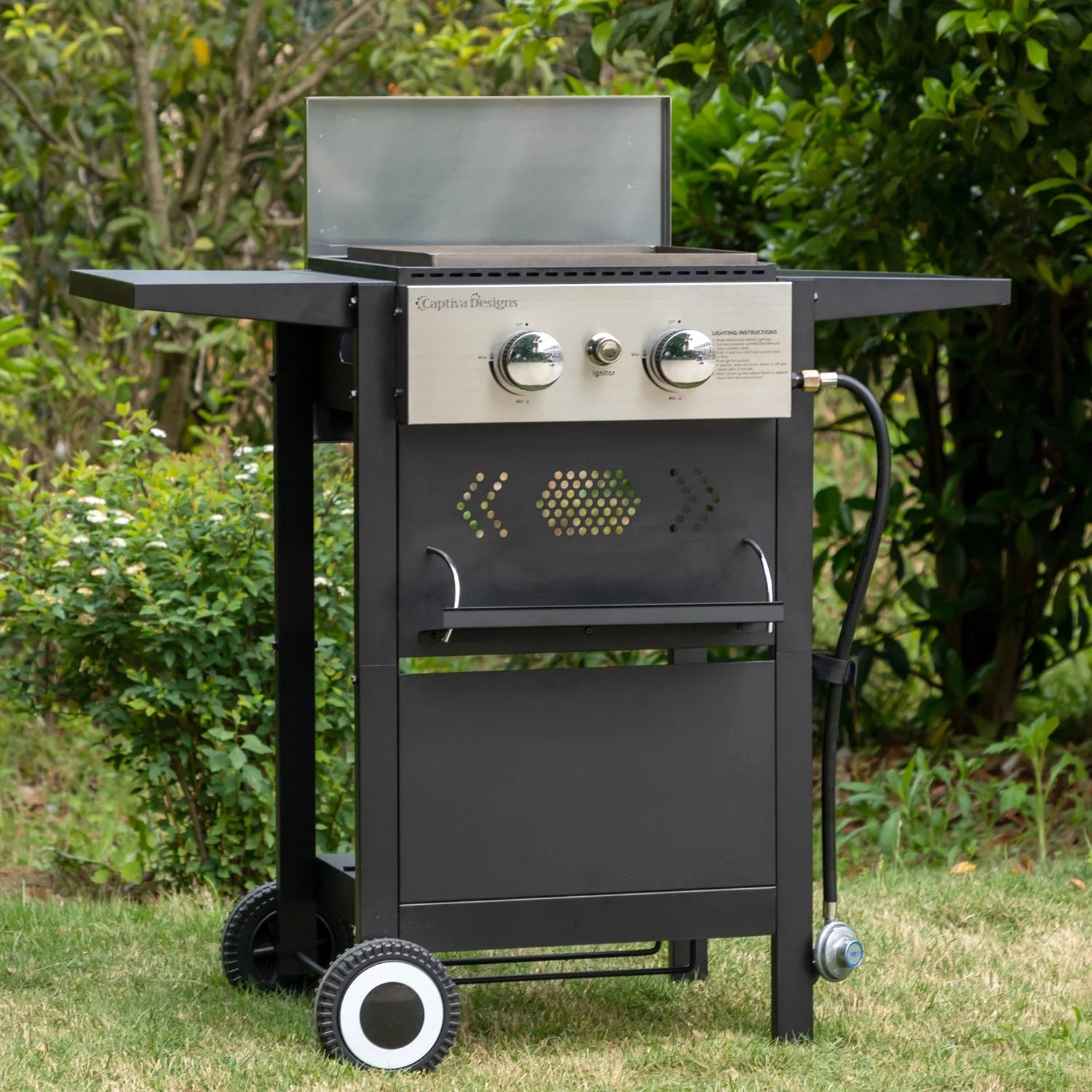 - ¡¾HUMANIZED DESIGNS¡¿There's a special place under the burner for a 20-LB propane tank, two side tables and a front shelf for placing some cutlery and tools. Also, the stainless-steel lid can also act as a wind blocker when lifted rather than only for covering use.